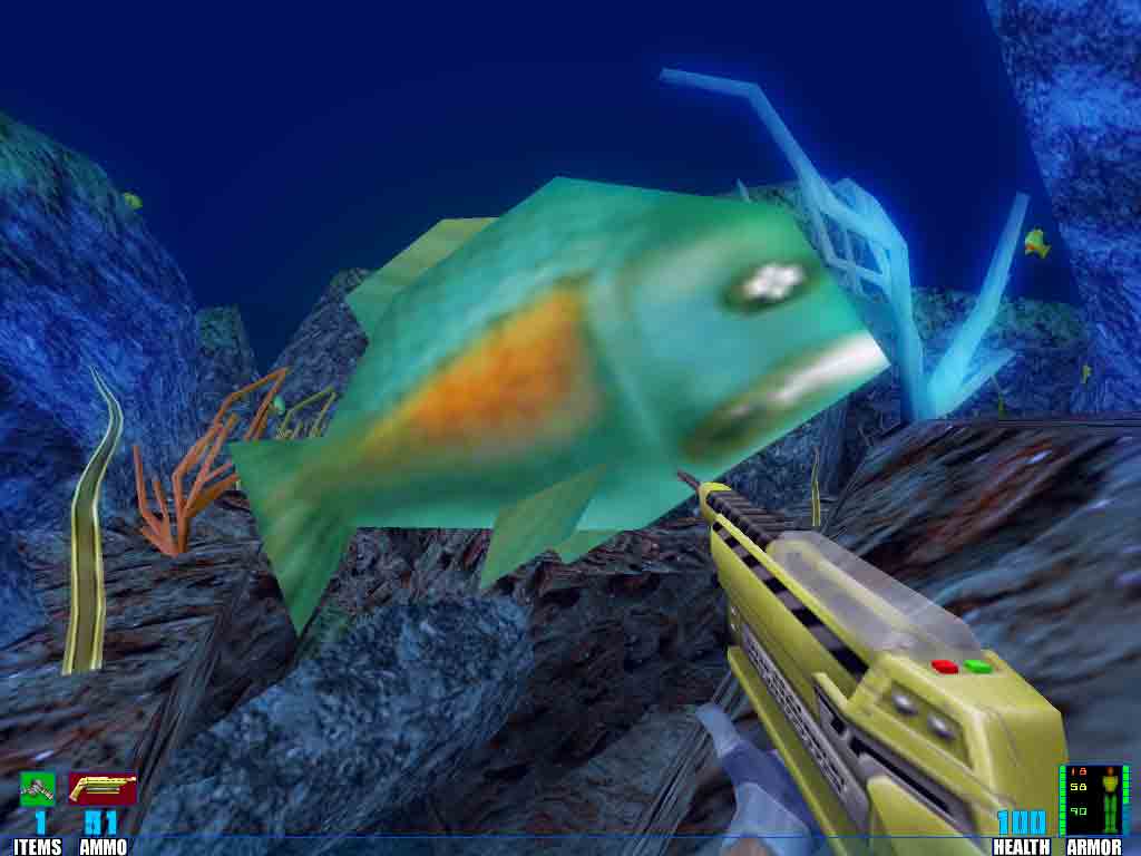 Remember playing the first SiN game? Remember the Dopefish? Well, he's BACK! I found him just today and I'm quite aware that everyone knows all about it / him by now, but I'm not one of those gamers who look up every possible secret in the game through forums and faqs, so it's news to me! Besides, it's much more fun this way. Here's a shot of our fish friend as he appears in Emergence. You can see he got upgraded since the last game!