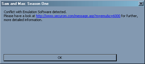 Yep, that sure smells like SecuROM. Feeling good about Telltale's choice of protection, I started the installation. It went smoothly and after it was done, I immediately ran the first episode to check if everything is working as it should. It wasn't. The game refused to boot and displayed this sweet message: